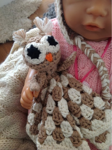 Lånar en av tjejernas dockor till modell, även jag har blivit lite uggleinspirerad :) det är ju ugglor över allt vart man än tittar, både i inredning och när det gäller kläder, och väldigt mycket när det gäller bebisgrejer, så jag följer strömmen och virkar i uggletema :D